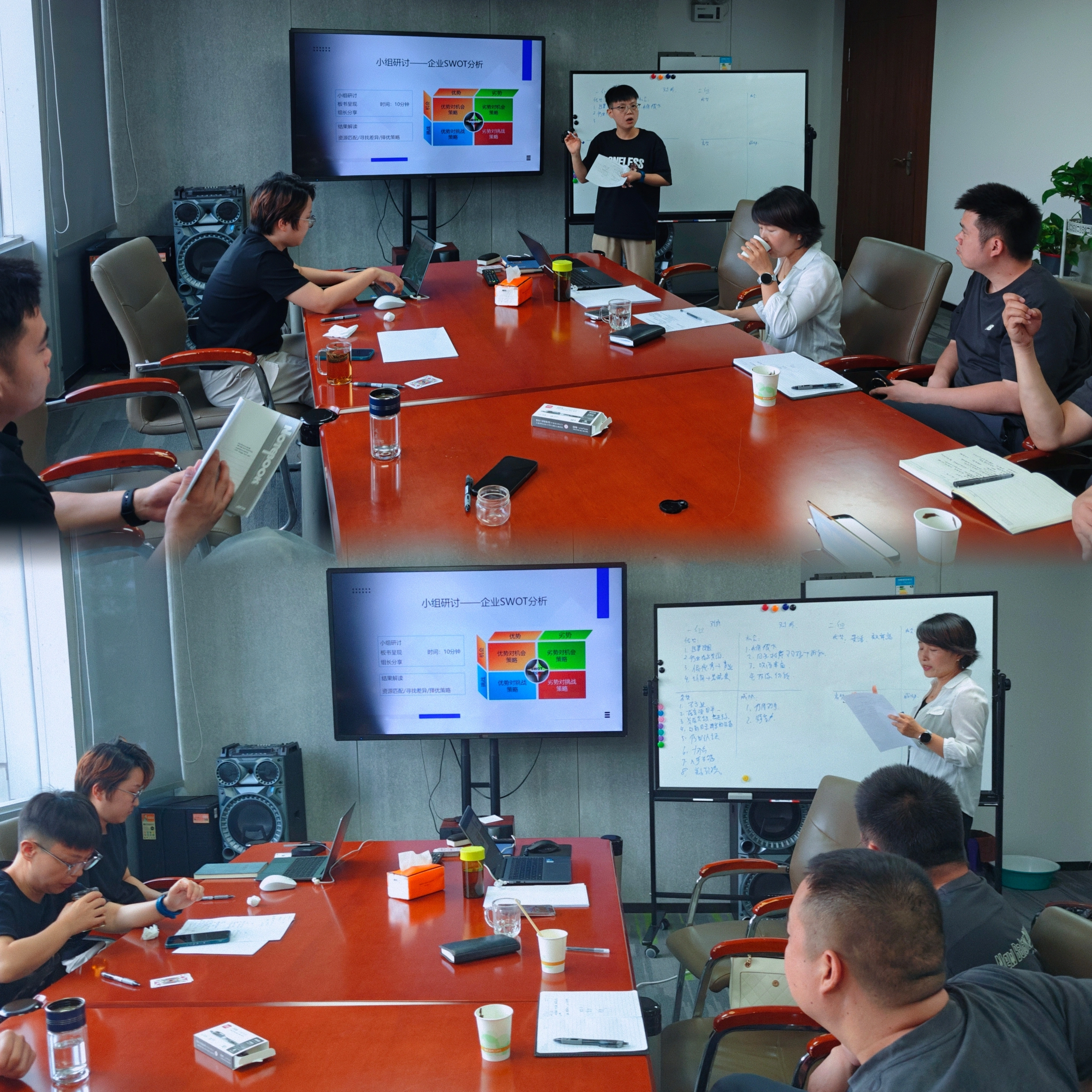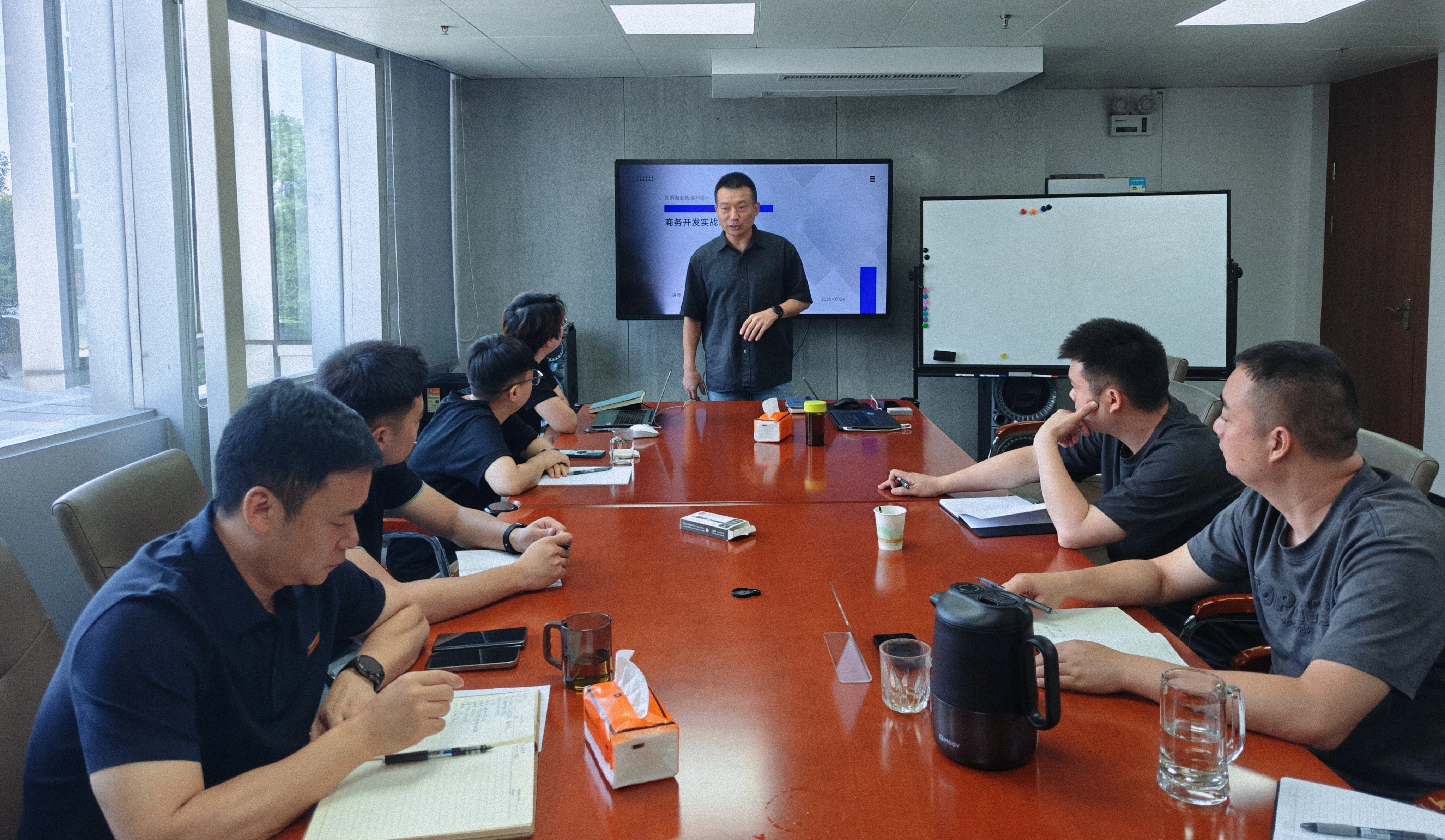 培训会上,汪总以行业发展趋势为切入点,深度解析当前市场竞争格局,主要为商务部、投融资部、运营等部门找准业务发力点提供方向指引。从围绕 “客户开发 - 商务洽谈 - 项目推进” 全流程,拆解实战技巧:从精准定位目标客户群体的方法论,到谈判桌上的沟通策略与细节潜在问题规避,再到项目执行中的进度管控与资源协调,循序渐进深入讲解实操要点。针对市场分析与团队建设,汪总特别强调行业大数据驱动决策的重要性,提出 “建立全员营销与高目标团队” 的全员作战理念。 实战演练加持,现场互动深化技能 为让理论知识转化为实际能力,巩固学习成果,现场设置三大实战环节:针对商务开发中的典型瓶颈问题,商务研讨形成解决方案,围绕 8月及后续商务开发目标,参会核心成员结合当前现状,以及培训内容提出具体策略,现场展开热烈探讨,大家积极发言献策,碰撞出诸多创新思路。