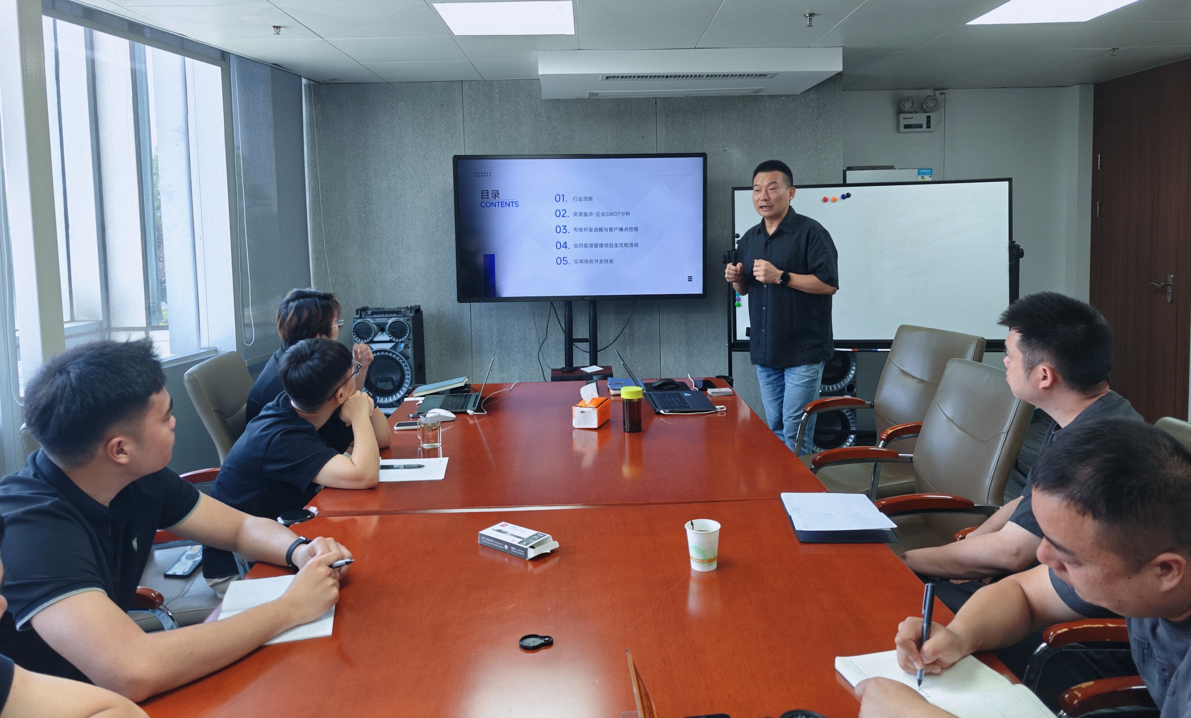 五大核心模块内容,构建业务能力体系 本次培训会内容覆盖面广、实用性强,围绕 5大核心模块展开深入讲解。汪总先是分享了精准的行业洞察,帮助大家如何把握市场动态与发展趋势风向;随后,从 “如何找客户”“如何谈客户” 到 “如何推进项目”,层层递进地拆解业务开展全流程技巧;同时,针对市场分析与项目管理等关键环节进行细致指导,为对外商务和对内运营业务部门协同作战指明方向。
